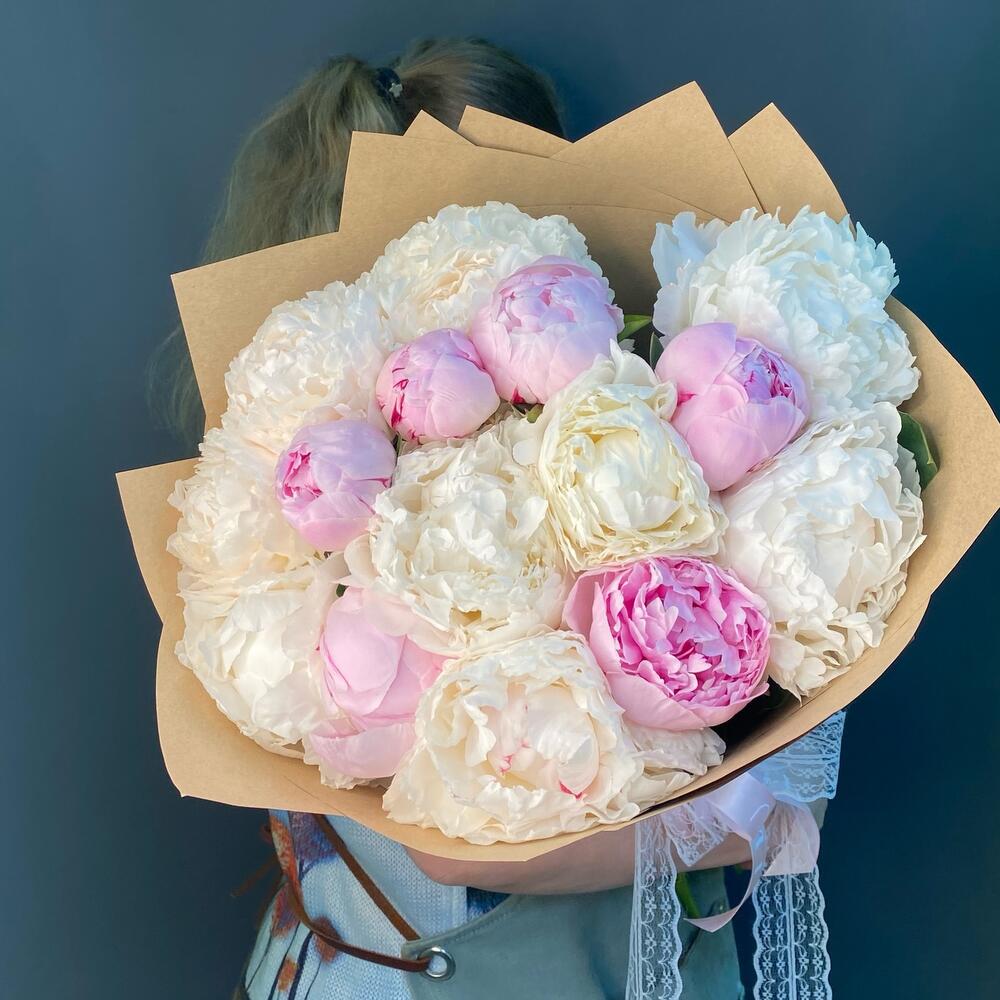 Большой букет из 15 Пионов в крафт бумаге . Выглядит невероятно красиво и нежно . Пломбирные шарики, словно мороженное в красивой обертке.