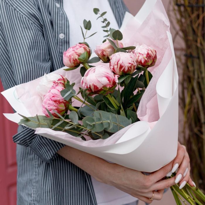Эвкалипт – 5 шт.Лента атласная – 1 шт.Тишью – 1 шт.Пион Сара Бернар – 7 шт.Аквапак – 1 шт.Корейская пленка – 3 шт.