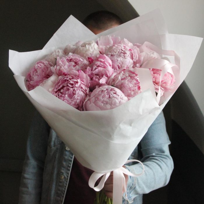 Нежный розовый букет из 15 пионов в лаконичной упаковке.Стильное цветочное решение для любого случая.Ширина букета около 40 сантиметров, высота пионов около 60 сантиметров.