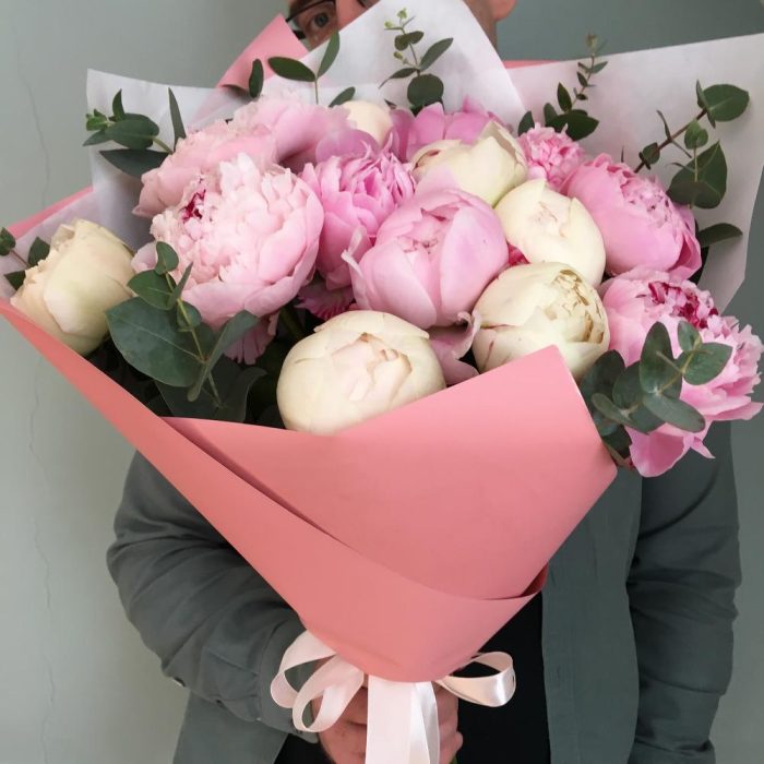 Роскошный букет из нежно розовых и сливочных пионов, 15 штук с веточками ароматного эвкалипта, в дизайнерской упаковке.Высота пионов шестьдесят сантиметров, ширина букета сорок сантиметров.Пышный и нежный букет пионов никого не оставит равнодушным.Стильное цветочное решение для любого случая.Отличный выбор для подарка на день всех влюблённых, 14 февраля.