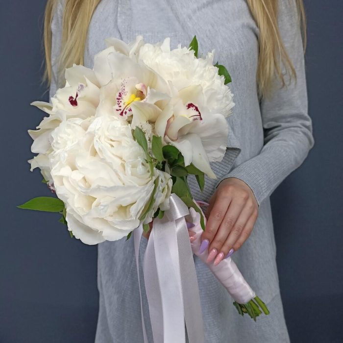 Пион – 5 шт.Орхидея Цимбидиум – 7 шт.Рускус – 7 шт.Лента атласная – 3 шт.