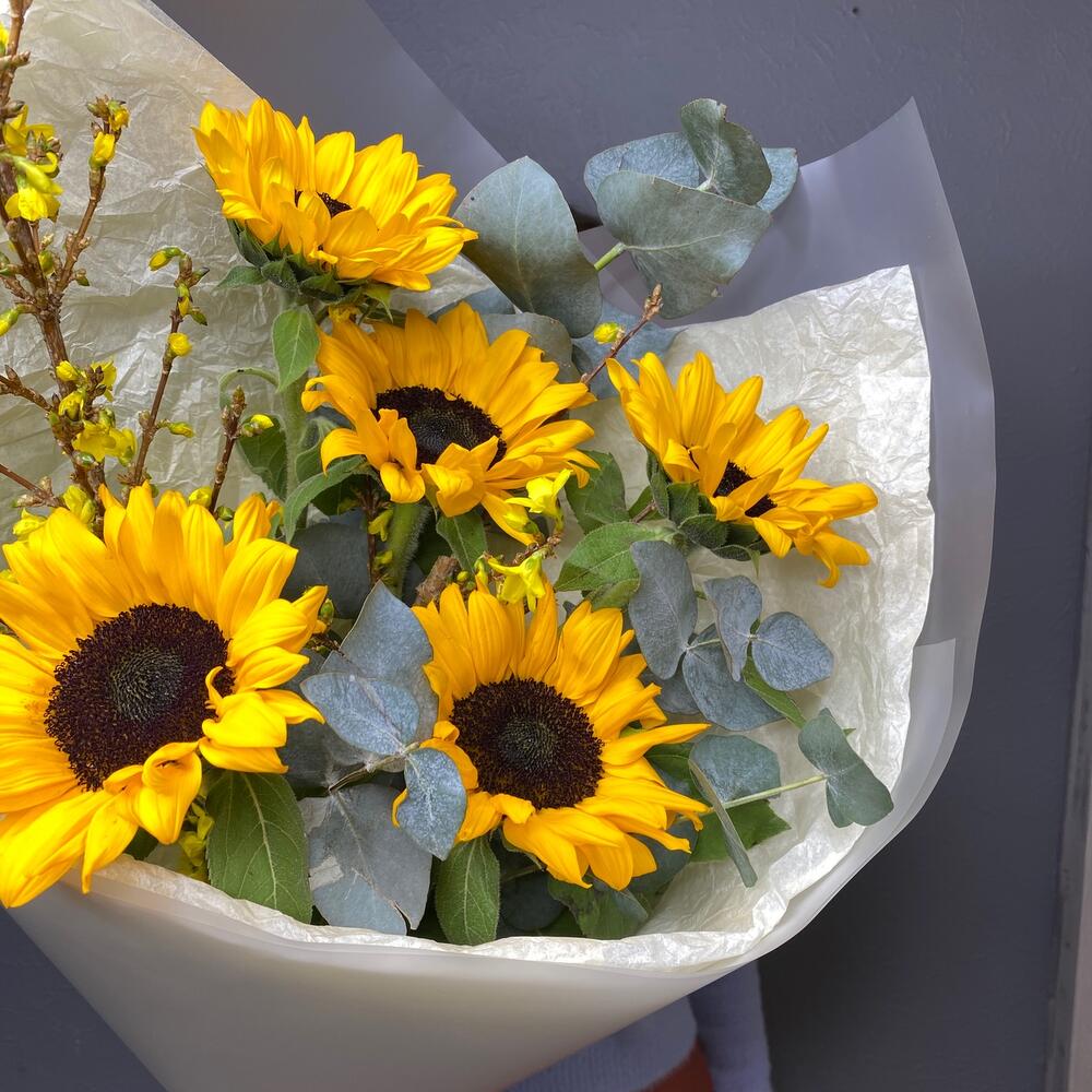 Лента атласная – 1 шт.Тишью – 2 шт.Подсолнух – 5 шт.Упаковка дизайнерская – 2 шт.Эвкалипт пучок – 1 шт.форзиция ветки – 2 шт.