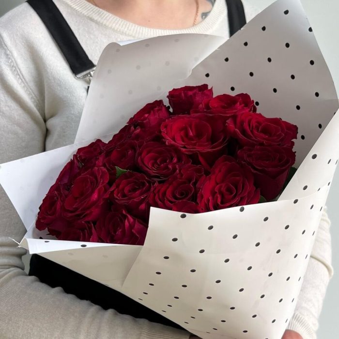 Лента атласная – 1 шт.Упаковка дизайнерская – 2 шт.Роза 40 см – 21 шт.