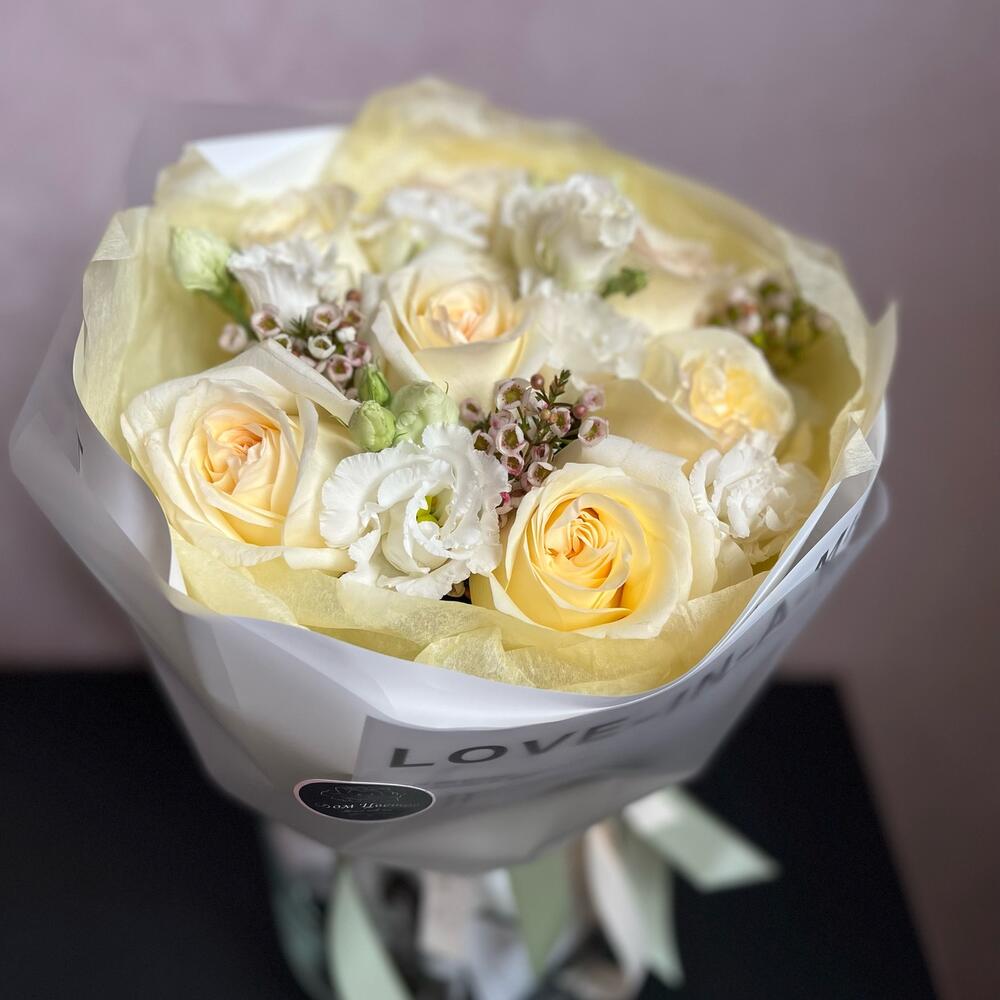роза candelight – 7 шт.Лизиантус (эустома) – 3 шт.Хамелациум – 3 шт.декоративная упаковка – 1 шт.Атласная лента – 1 шт.