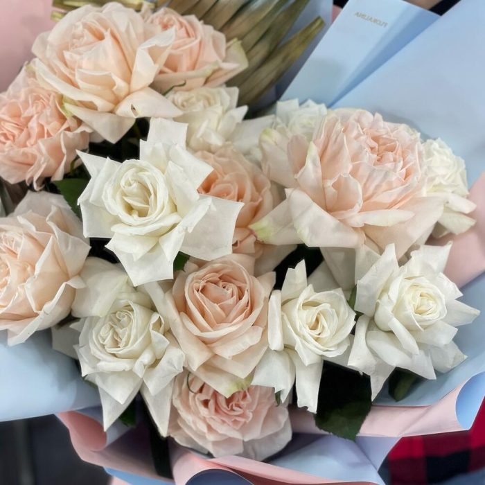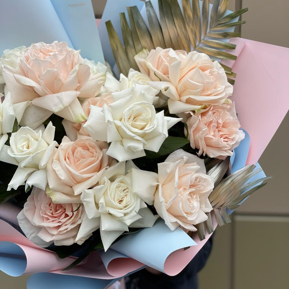 Карамельно-сливочный букет с ранункулюсами и пионовидными розами