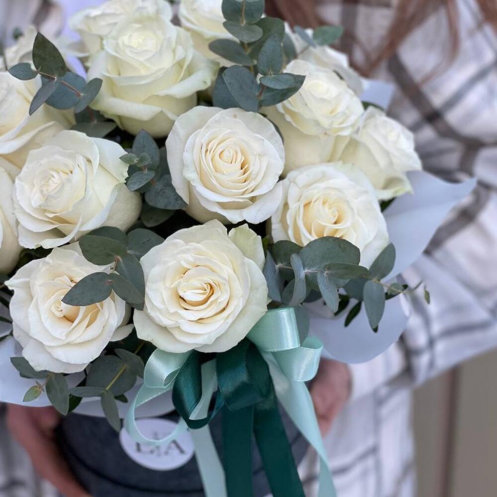 Эвкалипт – 5 шт.Роза Эквадор – 19 шт.Лента атласная – 2 шт.Коробка шляпная – 1 шт.Оазис флористический – 1 шт.