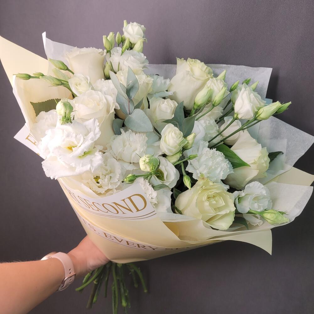 Роза Эквадор – 7 шт.Эустома – 5 шт.Диантус – 5 шт.зелень декоративная – 7 шт.Упаковка дизайнерская – 1 шт.Лента атласная – 1 шт.