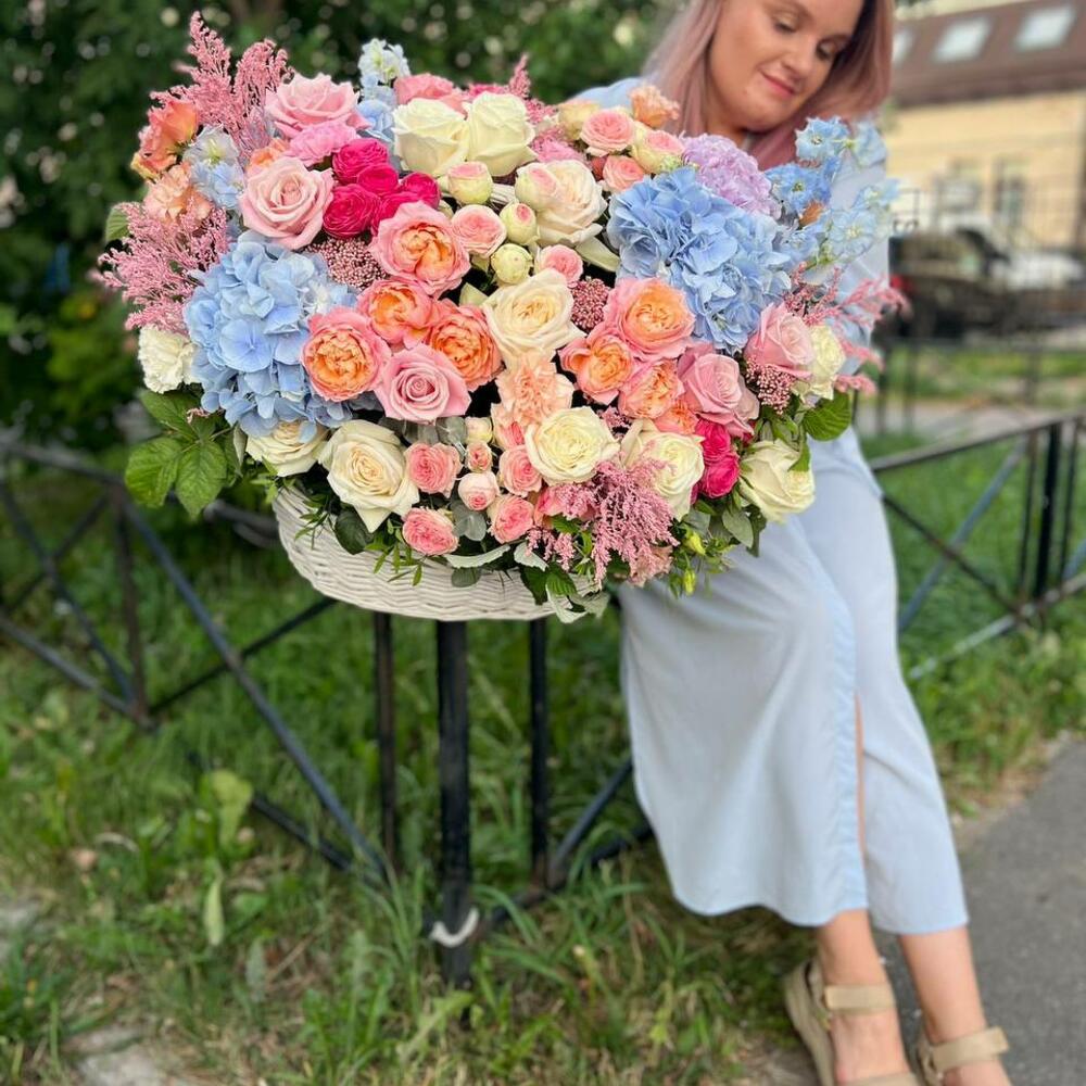 Большая корзина с гортензией, пион. розочками