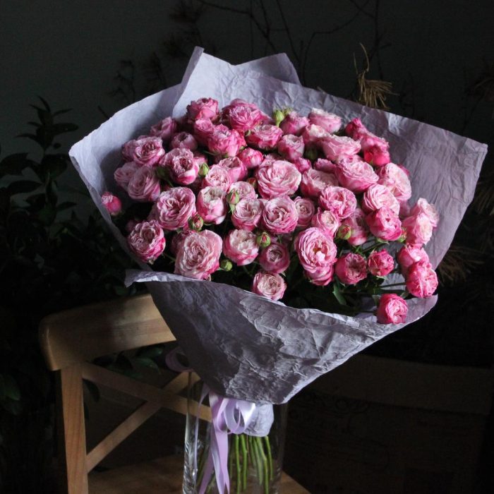 Роза кустовая пионовидная – 15 шт.Упаковка мятый крафт – 3 шт.Лента атласная – 2 шт.