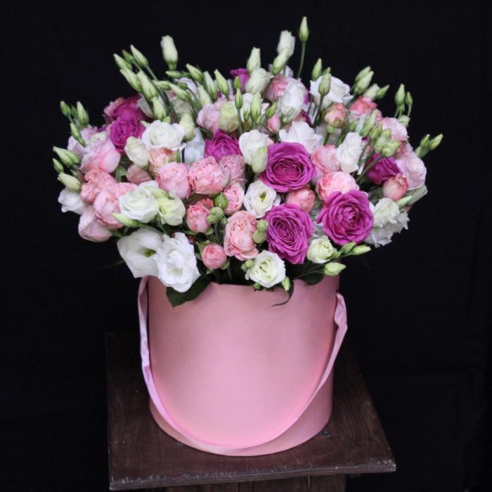 Роза кустовая пионовидная мадам бомбастик – 10 шт.роза кустовая пионовидная классик сенсейшн – 5 шт.Эустома – 10 шт.Оазис флористический – 1 шт.Шляпная коробка – 1 шт.