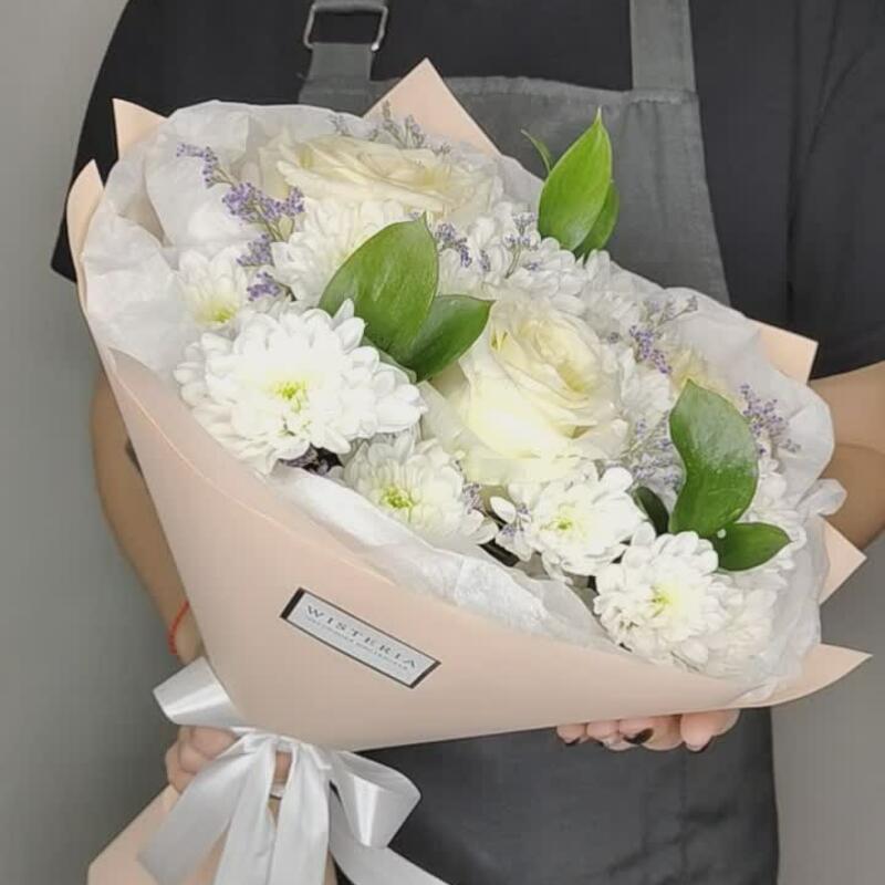 Букет ароматных роз, хризантемы и лилового лимониума "Нежность"
