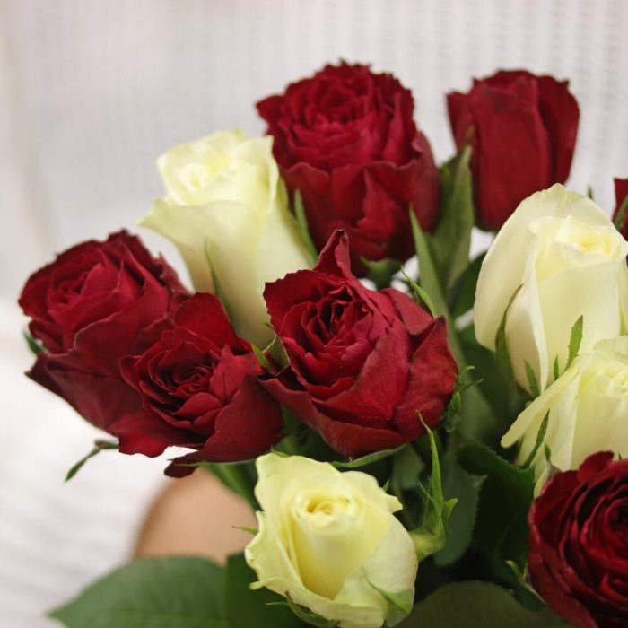 Букет из 11 красных и белых роз микс 35-40 см (Кения) под ленту
