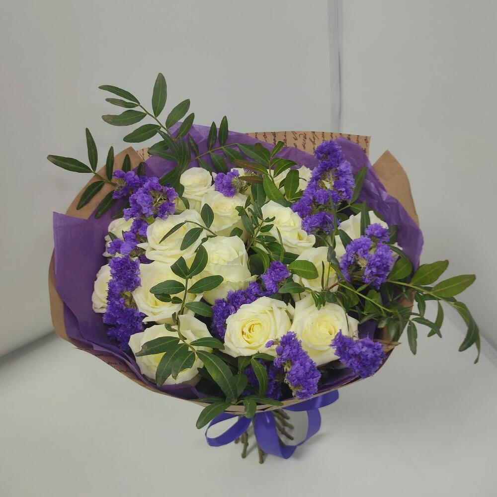 Статица – 2 шт.зелень фисташки – 2 шт.дизайнерская упаковка (крафт) – 1 шт.роза белая кения – 15 шт.