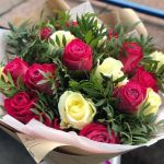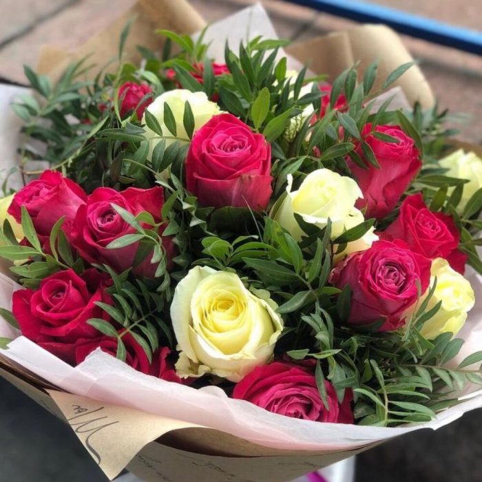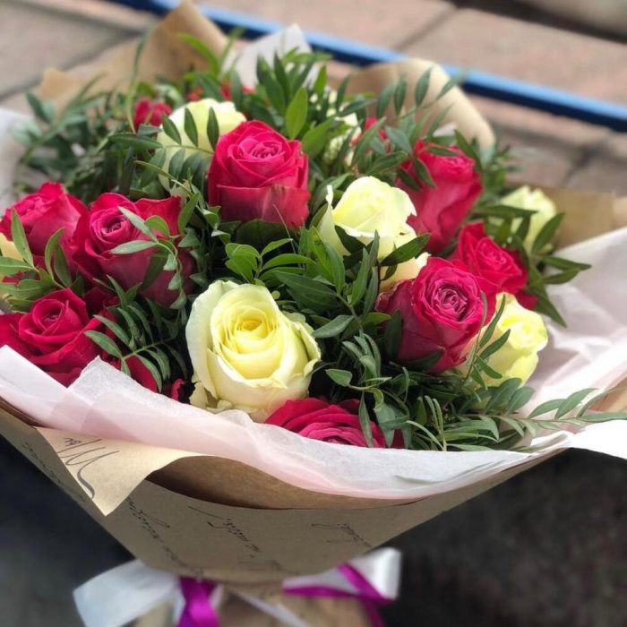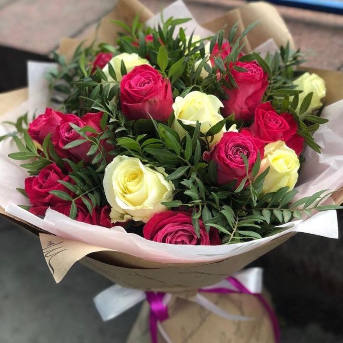 Пышный букет из роз с зеленью.