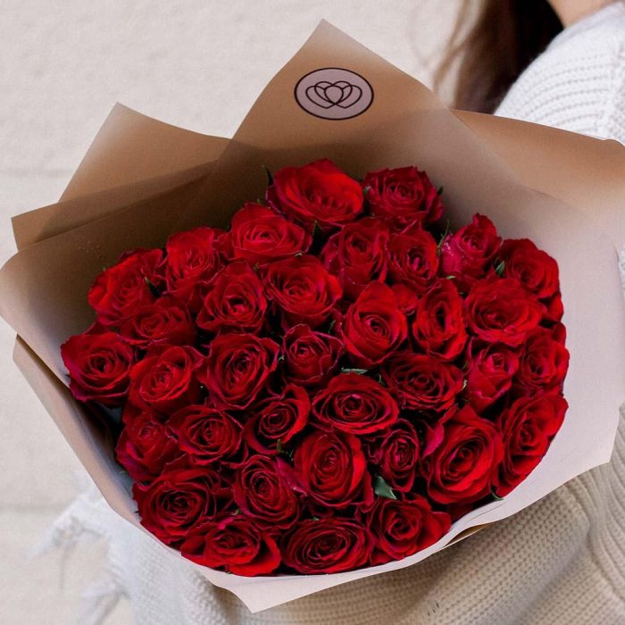 Букет из 35 красных роз (Кения) 40 см в кремовой пленке