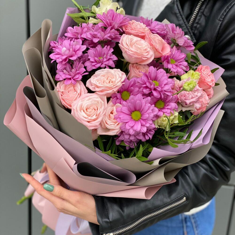 Нежный букет из кустовой розы, эустомы, хризантемы и зелени в оформлении!