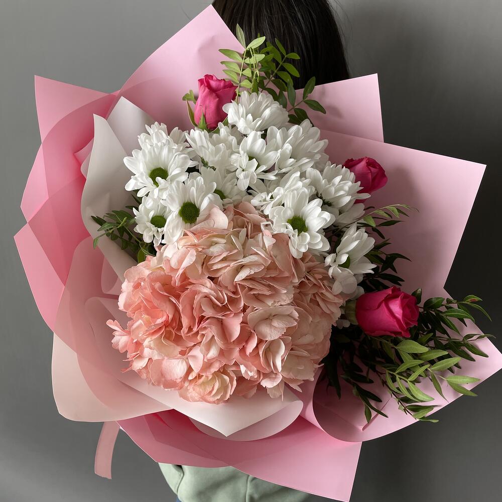Альстромерии, Гортензии, Кустовые розы, Лизиантусы, Розы, Хризантемы