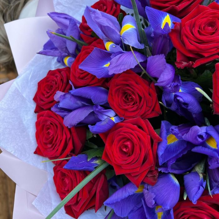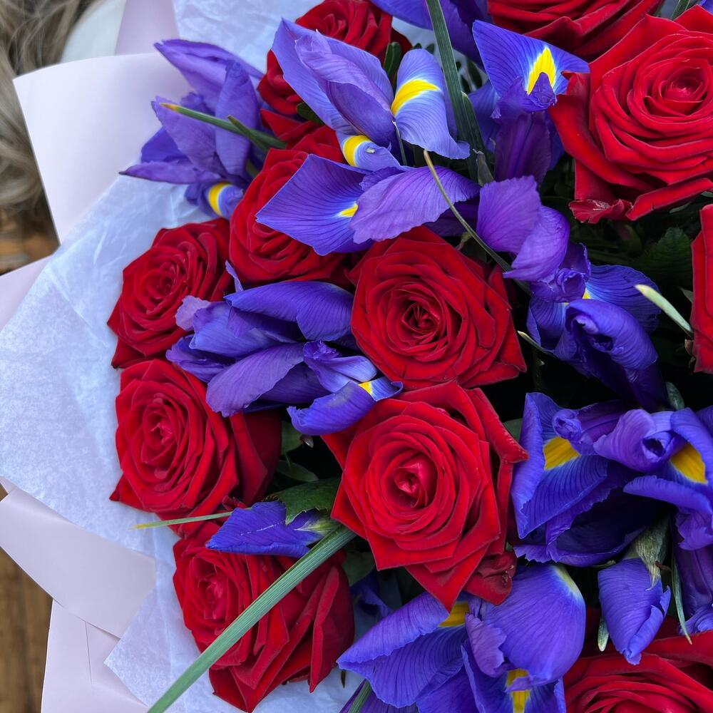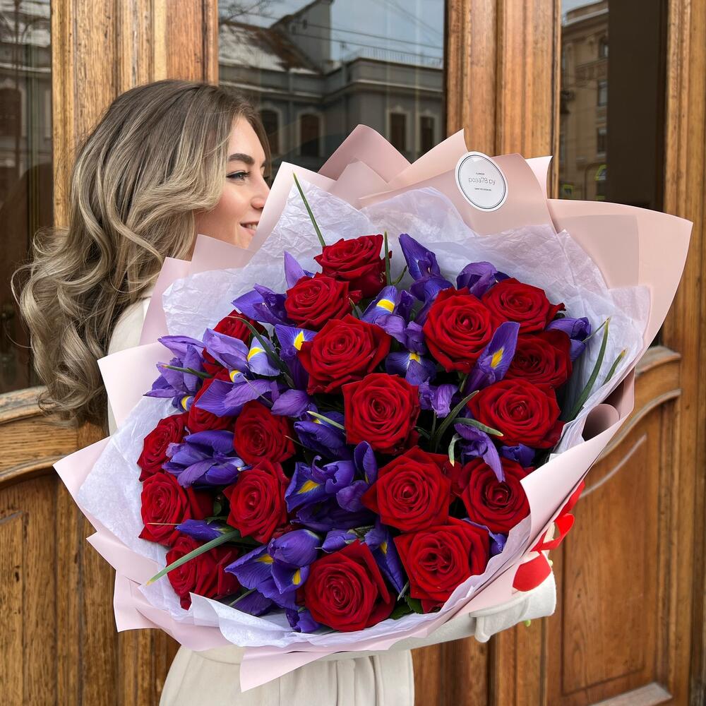 Роза красная 60 см – 19 шт.Ирис Blue Magic – 20 шт.Дизайнерская упаковка – 5 шт.Тишью – 1 шт.Лента атласная – 2 шт.