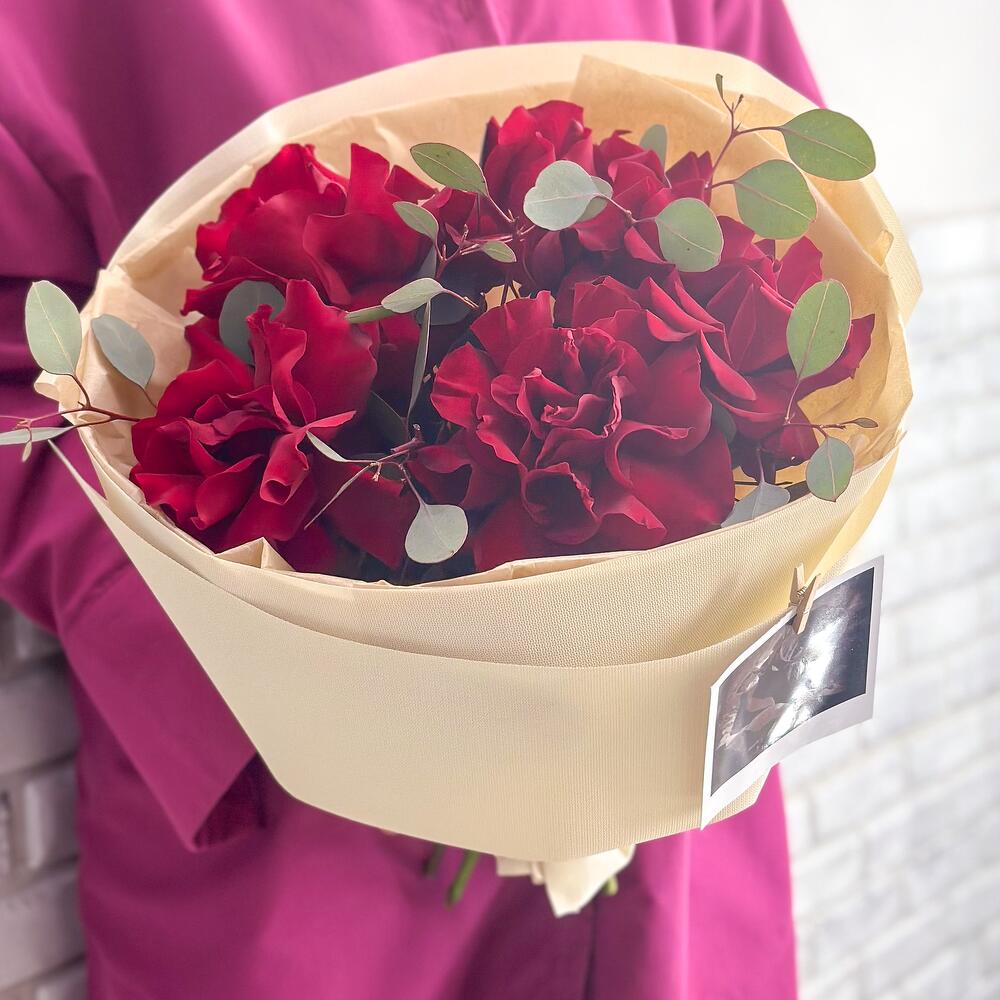 Эвкалипт – 1 шт.Лента атласная – 1 шт.Тишью – 3 шт.Роза Эксплорер – 5 шт.упаковка зефирка – 3 шт.