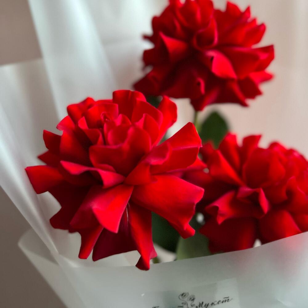 Роза красная – 3 шт.Лента атласная – 1 шт.Пленка матовая – 2 шт.