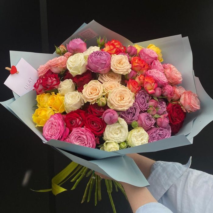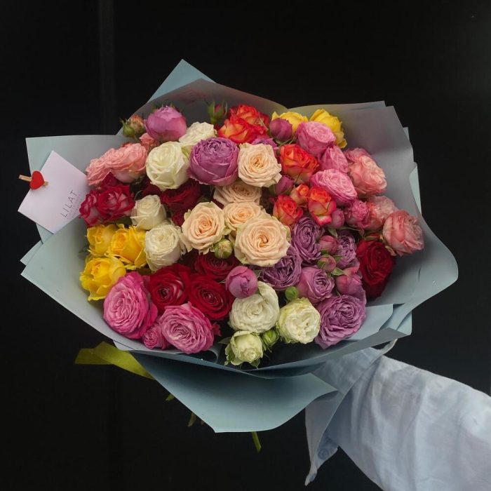 Пионовидная кустовая роза – 15 шт. Открыточка с вашими пожеланиями – 1 шт. Упаковка дизайнерская – 1 шт. инструкция по уходу за цветами – 1 шт.