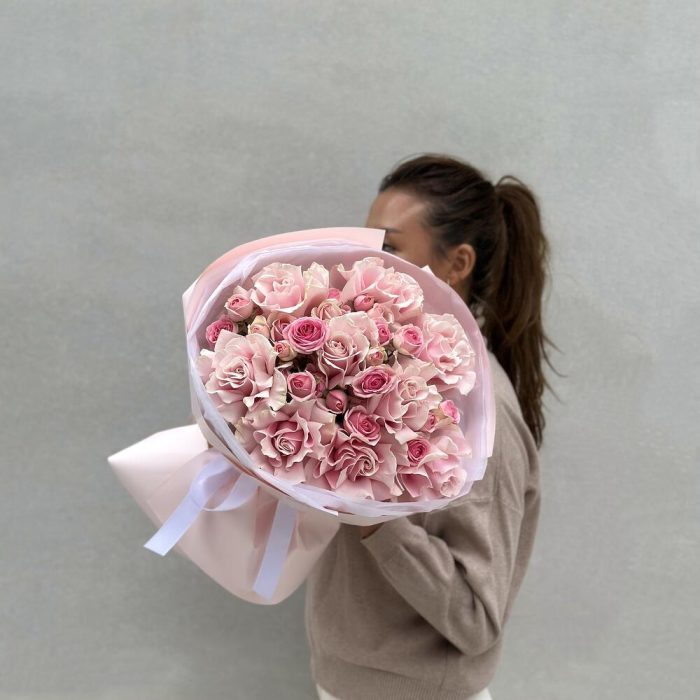 Воздушный букет из ажурных роз в нежных розовых оттенках. Состав: Роза 9 Спрей роза 7