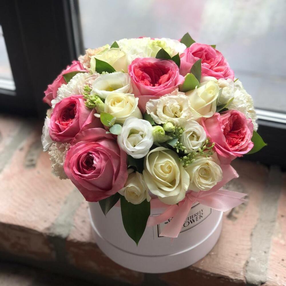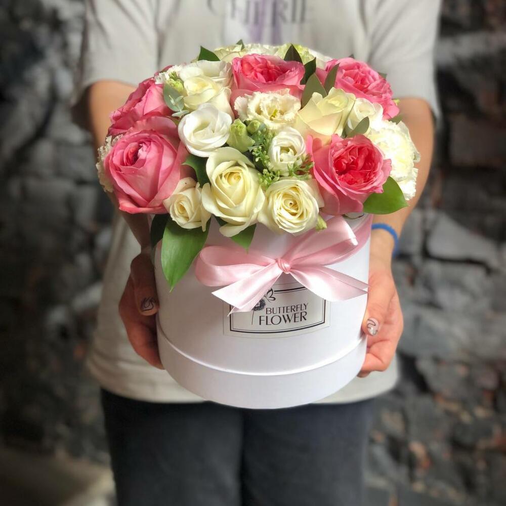 Шляпная коробка – 1 шт.Оазис – 1 шт.Роза пионовидная – 7 шт.Роза белая – 4 шт.Диантус – 4 шт.Эустома – 4 шт.Седум – 2 шт.Эвкалипт – 2 шт.Рускус – 2 шт.