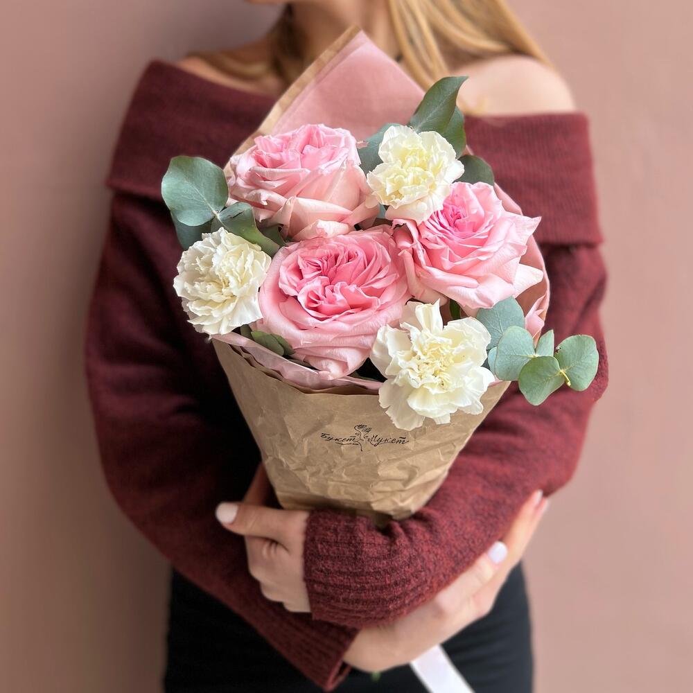 Эвкалипт – 1 шт.Лента атласная – 1 шт.Тишью – 1 шт.Диантус – 3 шт.Крафт – 1 шт.роза премиальная о’хара – 3 шт.