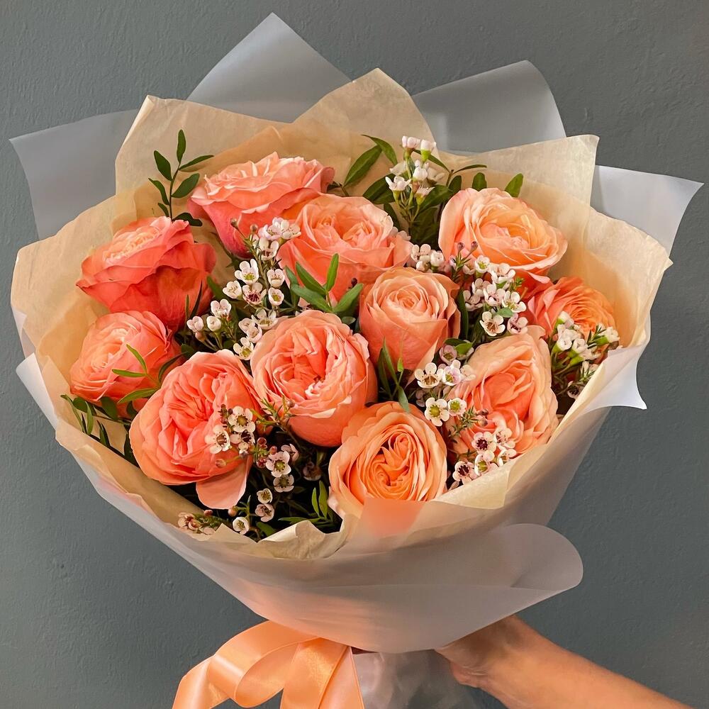 Ваксфлауэр – 2 шт.Лента – 1 шт.Роза одноголовая – 11 шт.Упаковка – 1 шт.Фисташка – 4 шт.