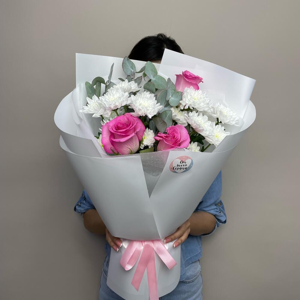 Гвоздики, Лизиантусы, Розы, Тюльпаны