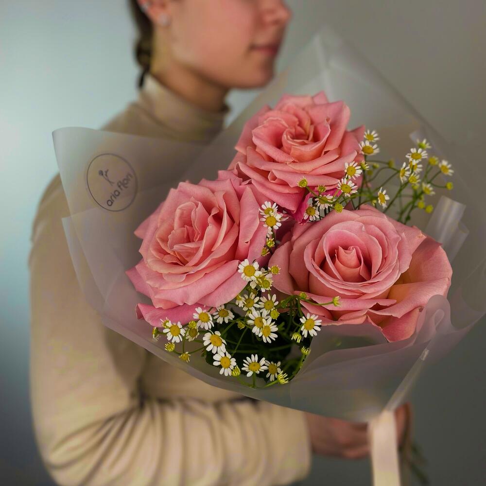 Матрикария – 3 шт.Упаковка дизайнерская – 1 шт.Эквадор роза – 3 шт.подкормка для срезанных цветов – 1 шт.любовь флориста – 100 шт.записка с вашим текстом – 1 шт.медиант ручной работ из бельгийского шоколада – 1 шт.