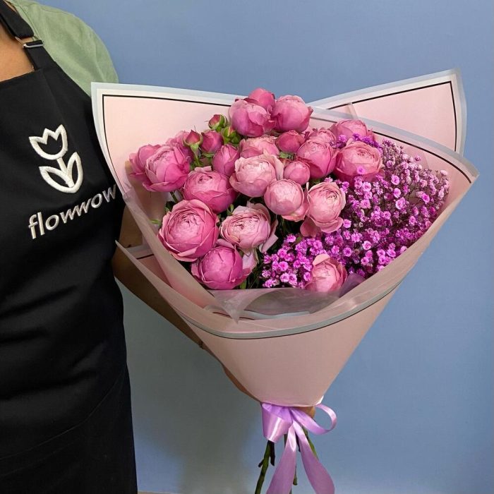 Букет пионовидных роз с гипсофилой