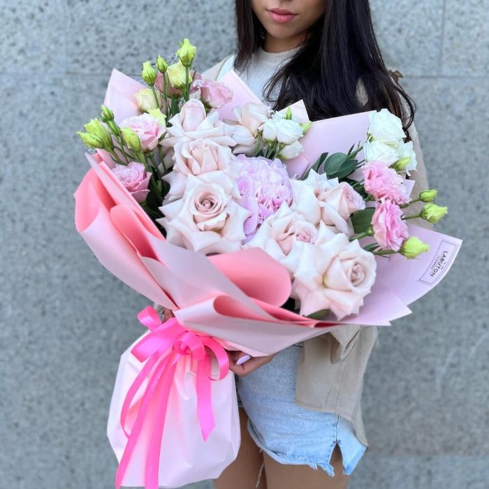 Альстромерии, Гвоздики, Кустовые розы, Лизиантусы, Розы, Хризантемы