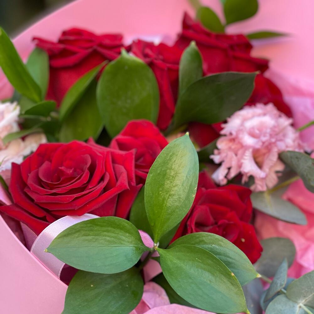 Лента – 1 шт.Лизиантус – 2 шт.Рускус – 5 шт.Эвкалипт – 1 шт.Роза одноголовая – 7 шт.Упаковка – 1 шт.