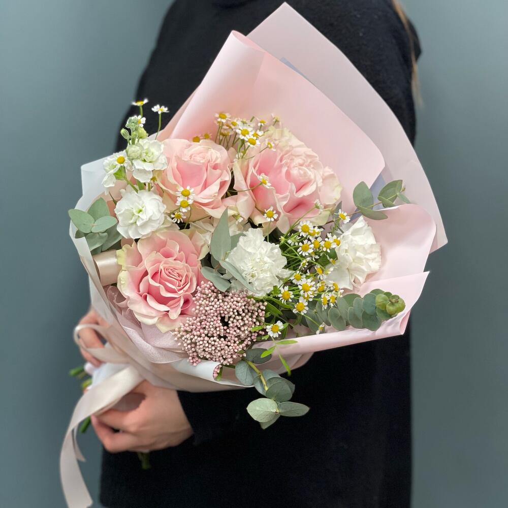 Лизиантус – 1 шт.Маттиола – 1 шт.Озотамнус – 1 шт.Эвкалипт – 1 шт.Роза одноголовая – 3 шт.Упаковка дизайнерская – 1 шт.