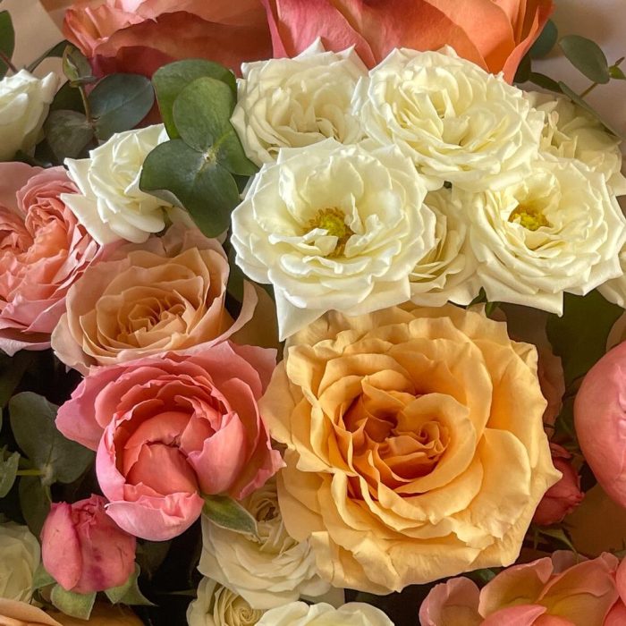 Лента – 2 шт.Роза кустовая – 4 шт.Эвкалипт – 3 шт.Роза одноголовая – 7 шт.Роза кустовая пионовидная – 3 шт.Упаковка дизайнерская – 3 шт.