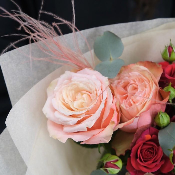 Эвкалипт – 1 шт.Упаковка – 1 шт.Диантус – 5 шт.Стифа – 2 шт.Роза пионовидная кахала – 3 шт.роза кустовая мирабелла – 3 шт.