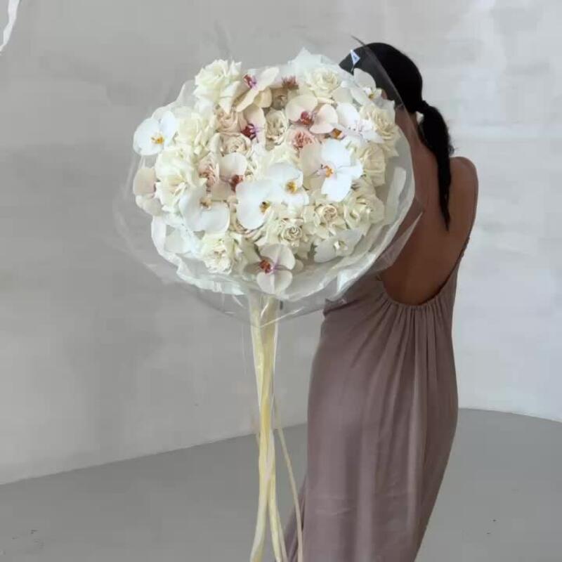 роза пионовидная плая бланка – 36 шт.Орхидея Фаленопсис – 19 шт.тишью кремовое – 1 шт.Слюда – 1 шт.открытка брендированная в подарок – 1 шт.