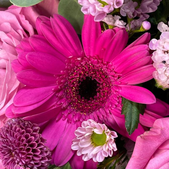 Букет с розами и герберами “Малиновый “