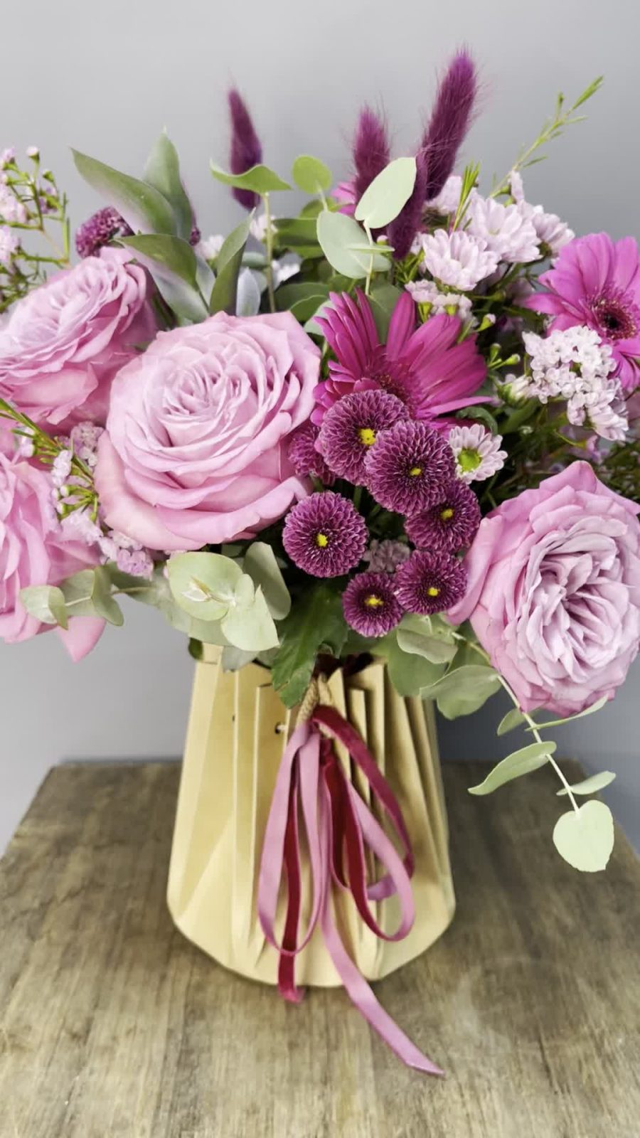 Ваксфлауэр – 3 шт.Лента – 2 шт.Рускус – 3 шт.Эвкалипт – 1 шт.Роза одноголовая – 7 шт.Гербера мини – 3 шт.Аквабокс – 1 шт.Пакет подарочный – 1 шт.Лагурус – 7 шт.хризантема сантини росси пинк – 2 шт.хризантема пурпетта – 3 шт.