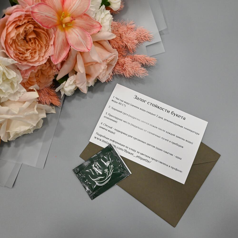 - Сроки возврата: Претензии по качеству букета принимаются в течение 24 часов с момента его получения.