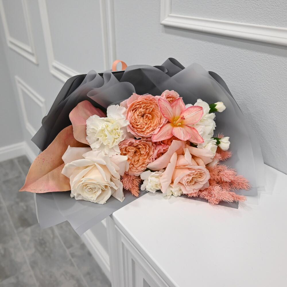 кустовая роза джульетта – 1 шт.Тюльпан – 1 шт.Диантус сортовой – 2 шт.Диантус кустовой – 2 шт.Роза shimmer – 1 шт.роза playa blanka – 1 шт.Лист магнолии – 2 шт.Аспарагус – 1 шт.Фисташка – 3 шт.Упаковка дизайнерская – 2 шт.Лента атласная – 1 шт.