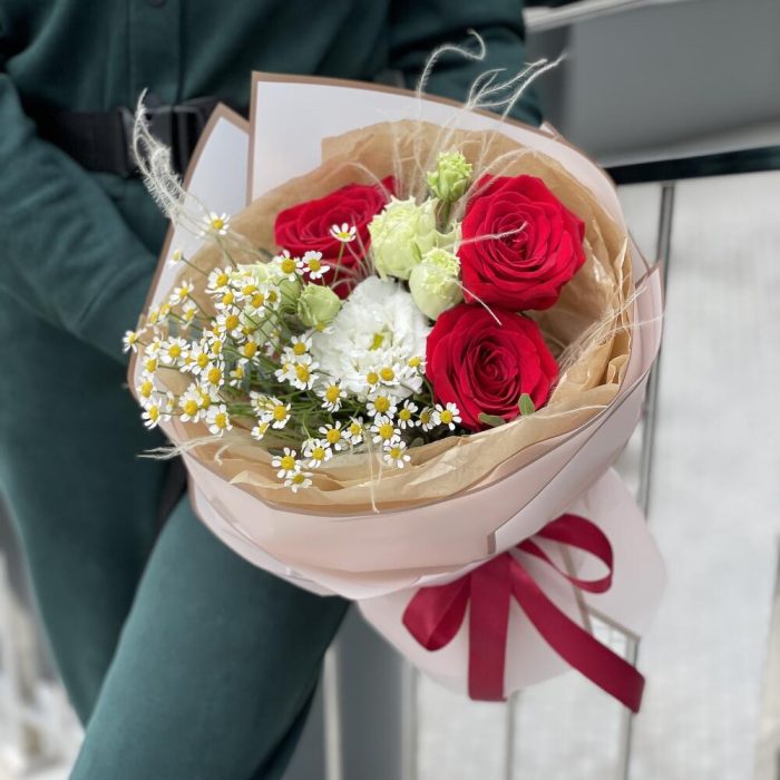 Писташ – 1 шт. Роза красная – 3 шт. Танацетум – 1 шт. Оформление – 1 шт. Стифа – 1 шт. эустома целебрик – 1 шт.