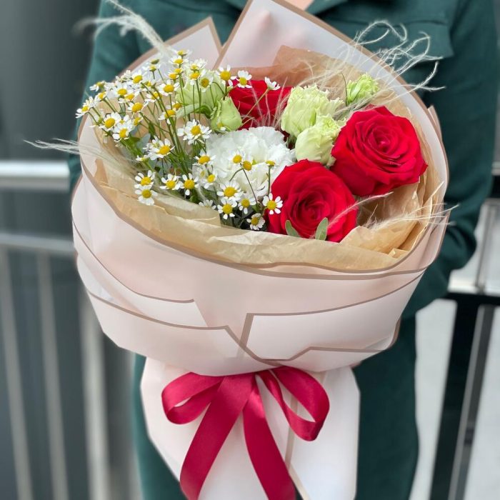 Букет Жаннет из роз, стифы, ромашек и эустомы