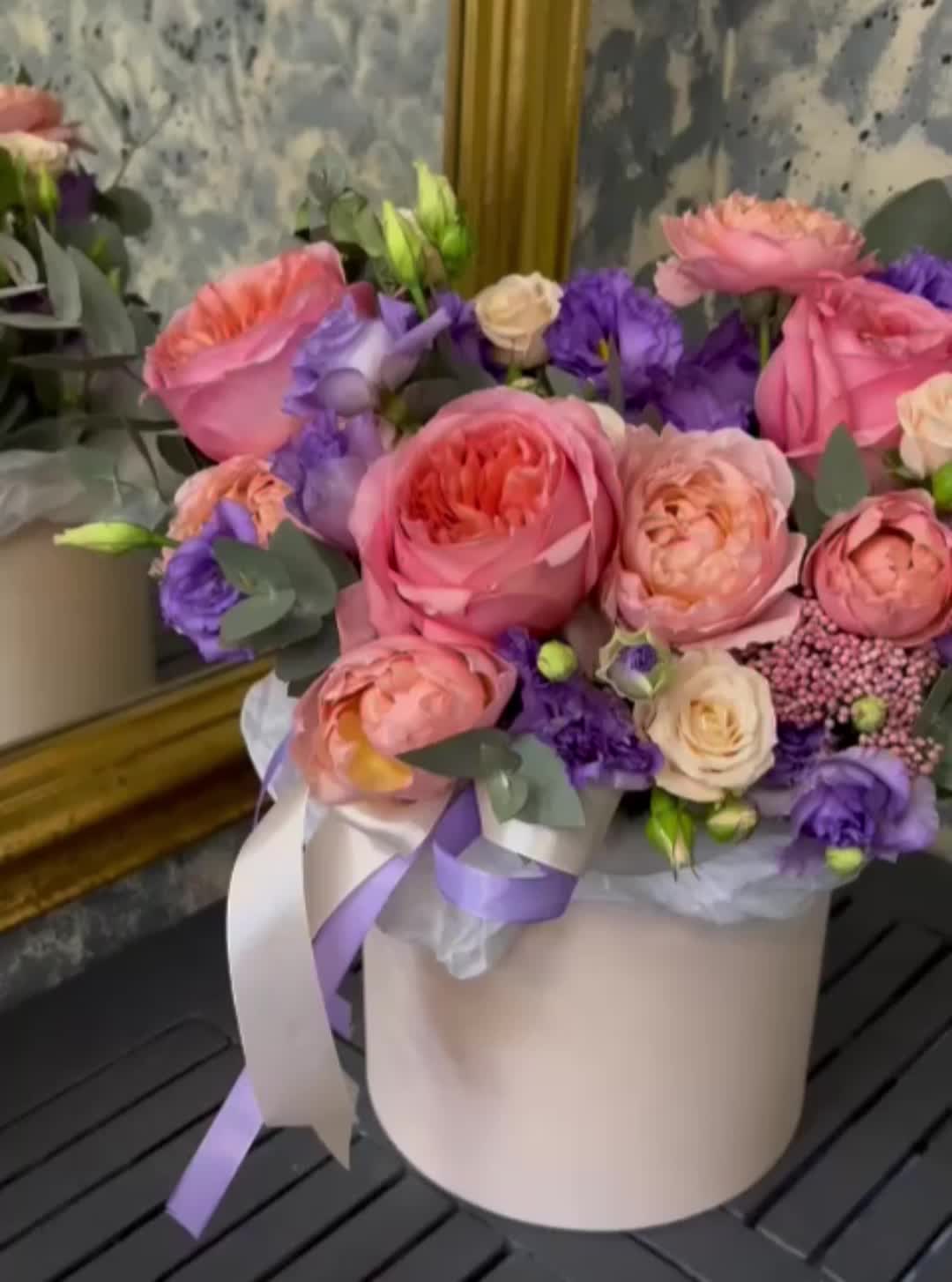 роза пионовидная пинк экспрешн – 3 шт.роза кустовая таня – 1 шт.роза пионовидная кустовая джульетта – 1 шт.эустома лавандовая – 3 шт.Озотамнус – 1 шт.Эвкалипт – 3 шт.Тишью – 1 шт.Оазис флористический – 1 шт.Коробка шляпная – 1 шт.Лента атласная – 2 шт.