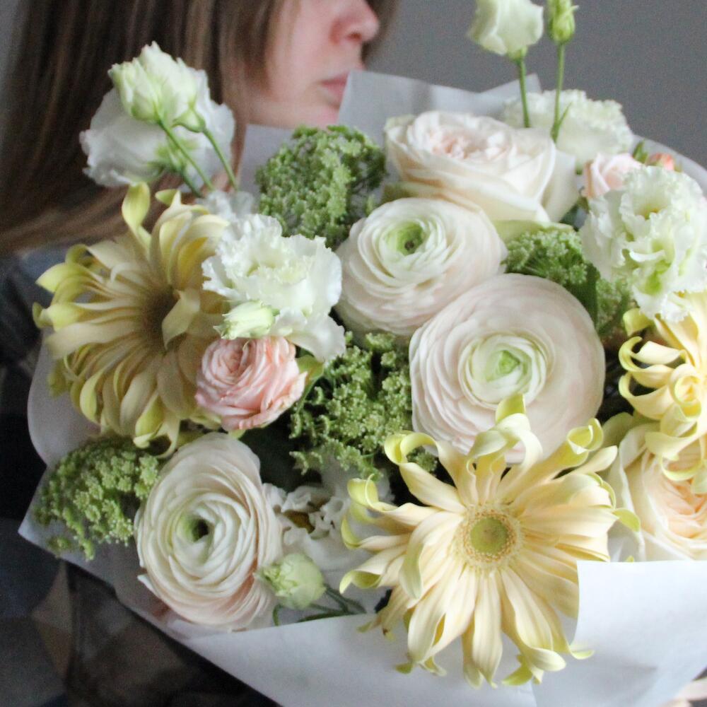 Ранункулюс – 3 шт.гербера кучерявая – 3 шт.Роза пионовидная – 3 шт.Роза кустовая пионовидная – 2 шт.Лизиантус – 3 шт.Амми – 4 шт.Упаковка – 1 шт.