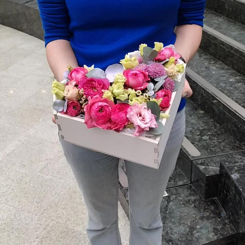 Роза кустовая пионовидная – 2 шт.Лизиантус – 2 шт.Хризантема кустовая – 1 шт.Ваксфлауэр – 1 шт.Эвкалипт – 1 шт.ящик сердце деревянный – 1 шт.