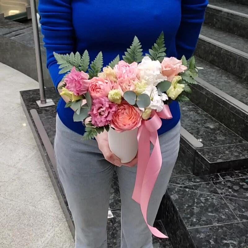 Лента – 2 шт.Лизиантус – 2 шт.Папоротник – 2 шт.Гвоздика – 1 шт.Роза кустовая пионовидная – 1 шт.Стакан – 1 шт.