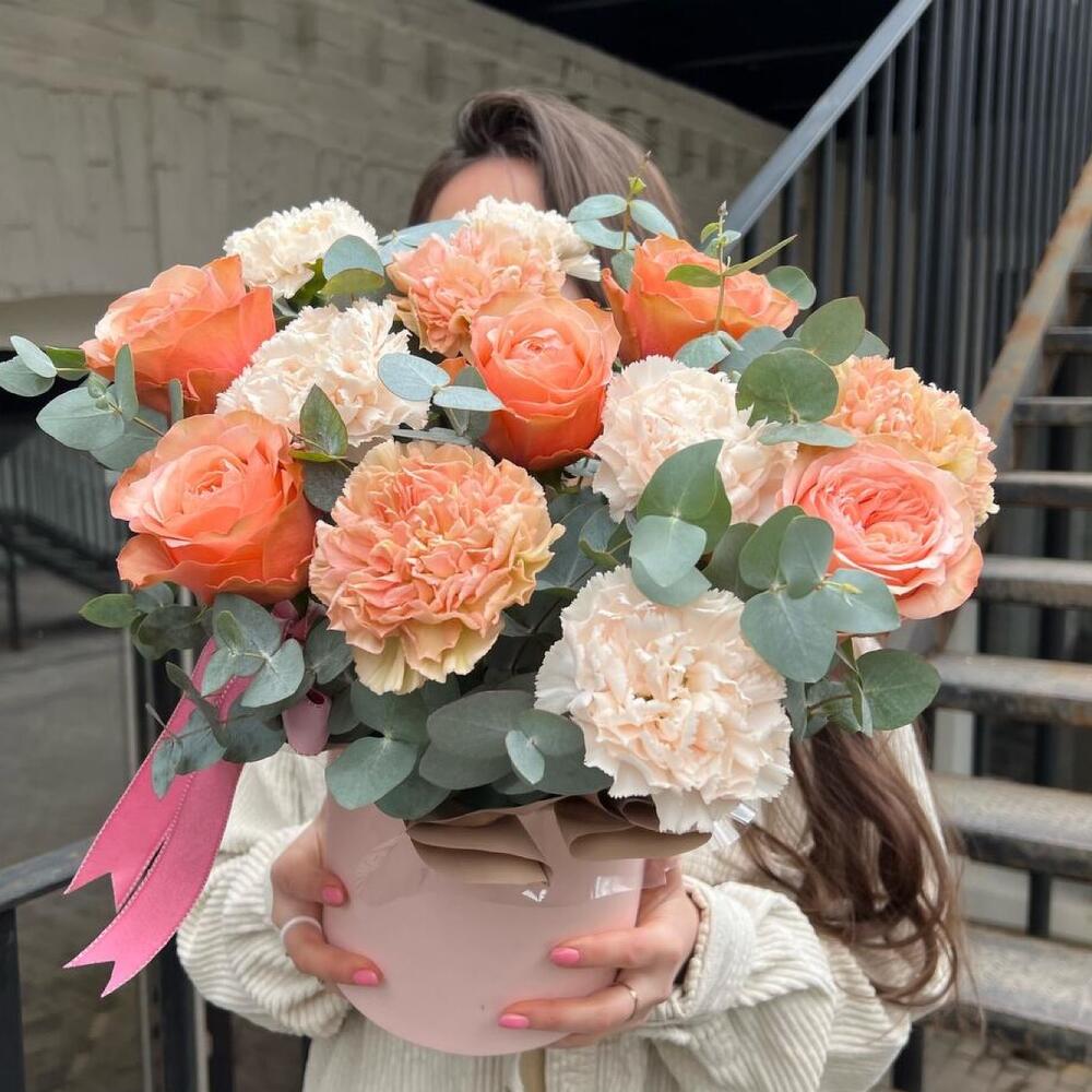 Гвоздики, Пионовидные розы, Розы