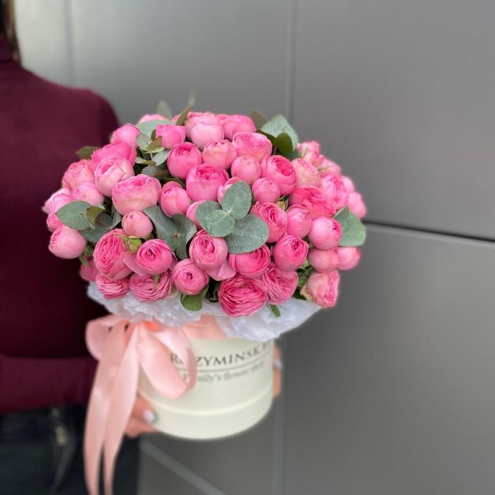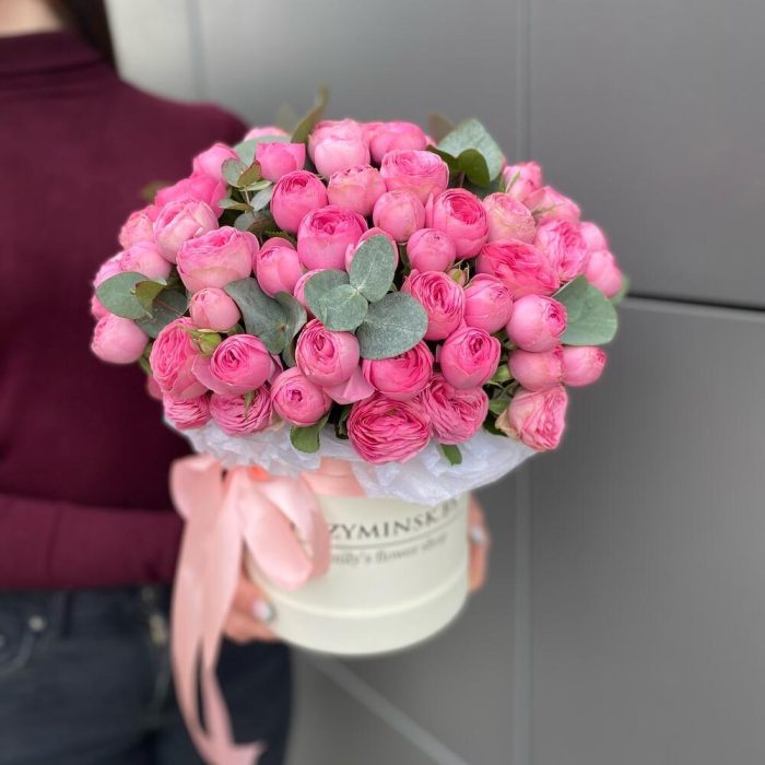 Композиция в шляпной коробке с пионовидными кустовыми розами сорта Жизель